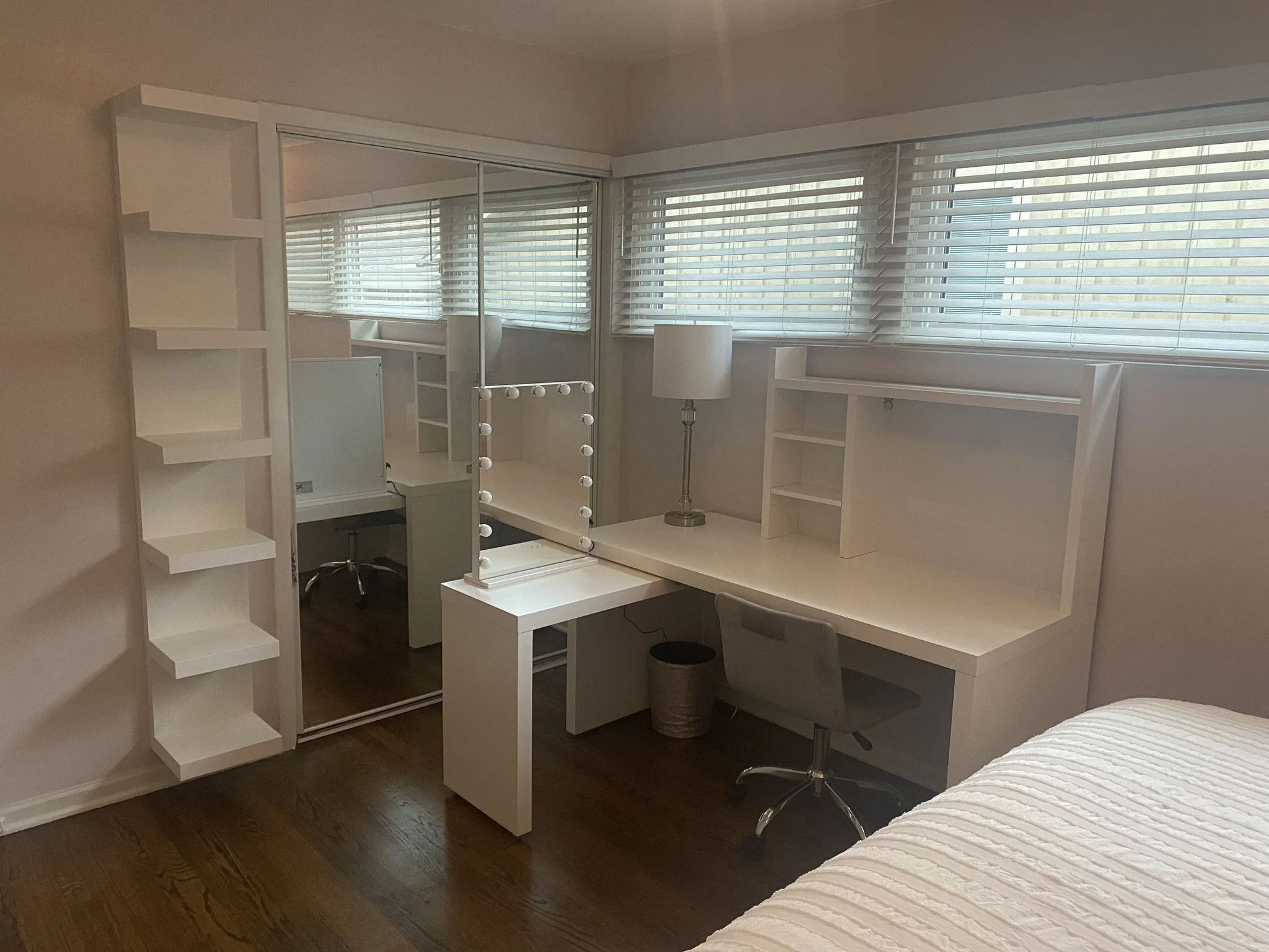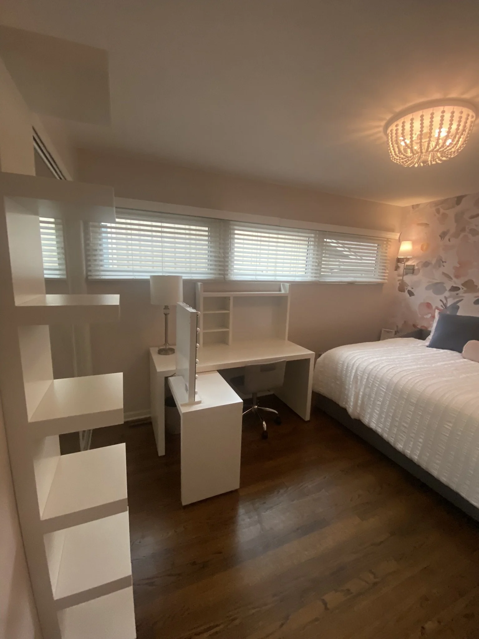 Added an L-shaped desk for dual functionality — it added vanity space as well as a place to do homework