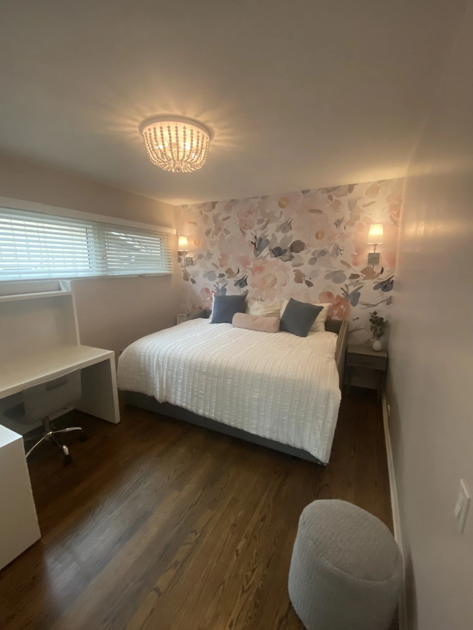 Made the room appear larger by adding wallpaper in a trendy, floral design to one wall